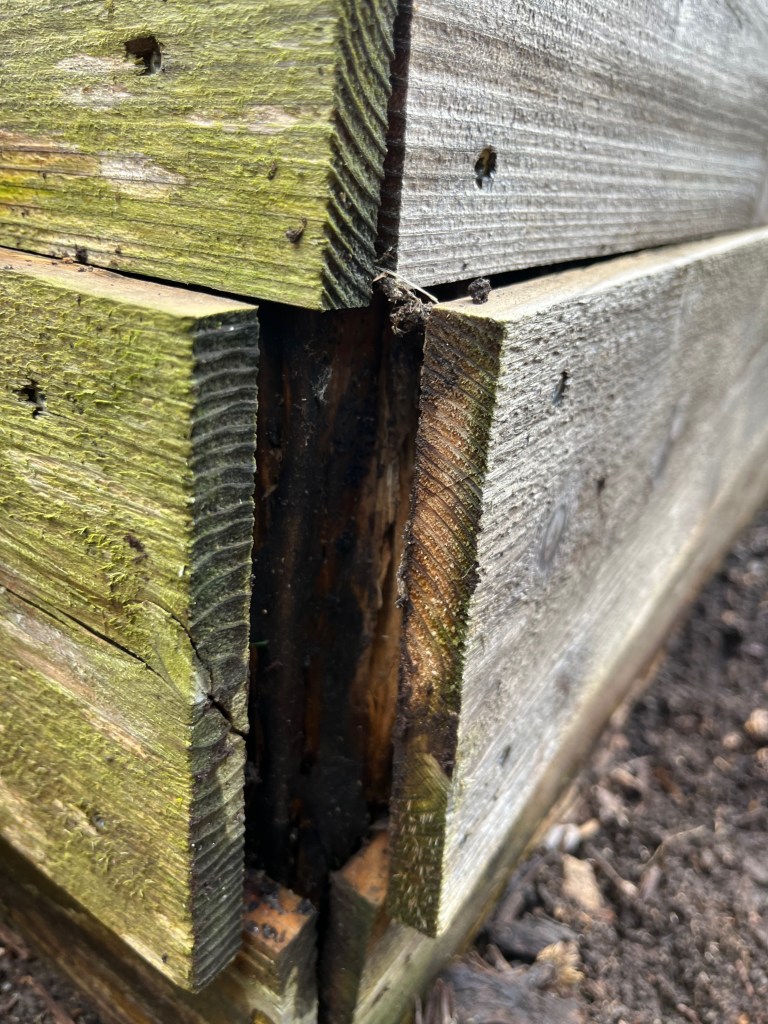 First, I cleared out all the dead tomato and pepper plants. As I was tidying up the beds, I noticed one of the boards was loose. Upon further investigation, I learned the problem ran deeper than a loose board. The support beam in my bed had rotted. Thankfully, I’m quick on my feet. I grabbed my shovel and started removing the soil from that side of the bed. I still had some scrap wood, so I planned to replace the support. Once I started removing the dirt, I discovered a second rotted beam. At this point, I fully expected every beam in the bed to be rotten. I was correct. I knew right then the leaves would have to wait. I had to deal with repairing this bed.