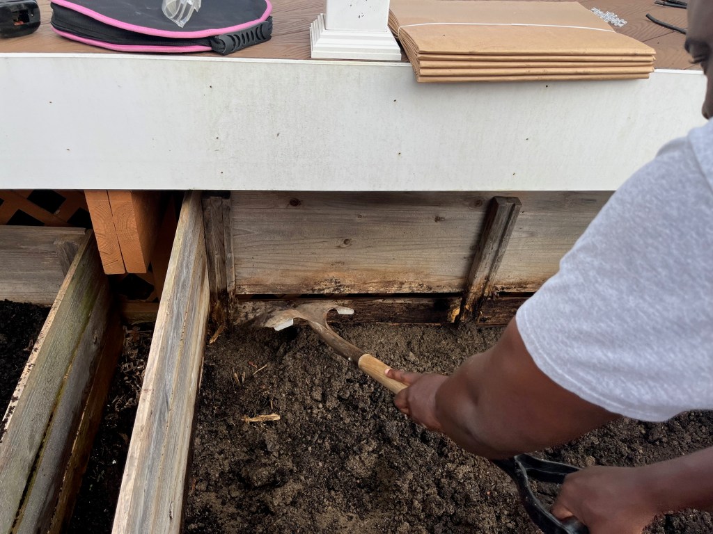 My plan was to remove all the dirt from the bed and then pull it out and rebuild it. My husband, being the sweet and supportive person he is, came outside to help me empty the bed. He immediately came up with a quicker, less labor-intensive fix to the problem. The rotting only happened two cedar panels up. It appeared the water wasn’t draining very well, so it pooled at that level. The rest of the beams above that level were still intact. We removed the second level and made the bed shorter. We installed L-brackets in place of the beams to avoid rotting issues in the future.