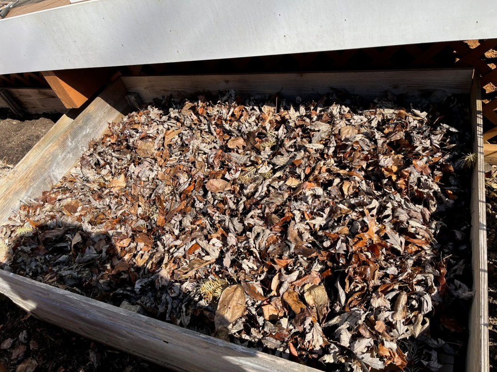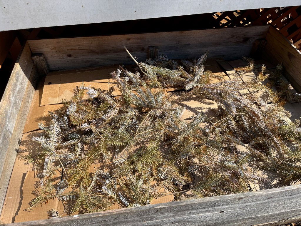 My existing beds are pretty high and probably don’t need any more soil, but I want to do some weed control and add nutrients. I’ve been saving cardboard boxes to place in all my beds, so I added a layer of cardboard and then wet the cardboard. Next, I added a layer of my Christmas tree cuttings and leaves. Last, I added compost. The cardboard will keep the weeds at bay, and the tree cuttings and leaves will be additional nutrients for the soil.