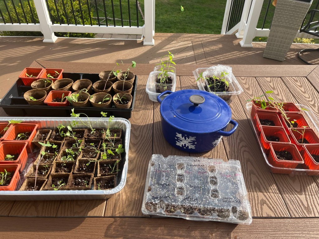 I did manage to photograph a few of my seedlings. The eclipse was also the day I started hardening them off. They aren’t as cute as my babies, but I think this picture will have to do.