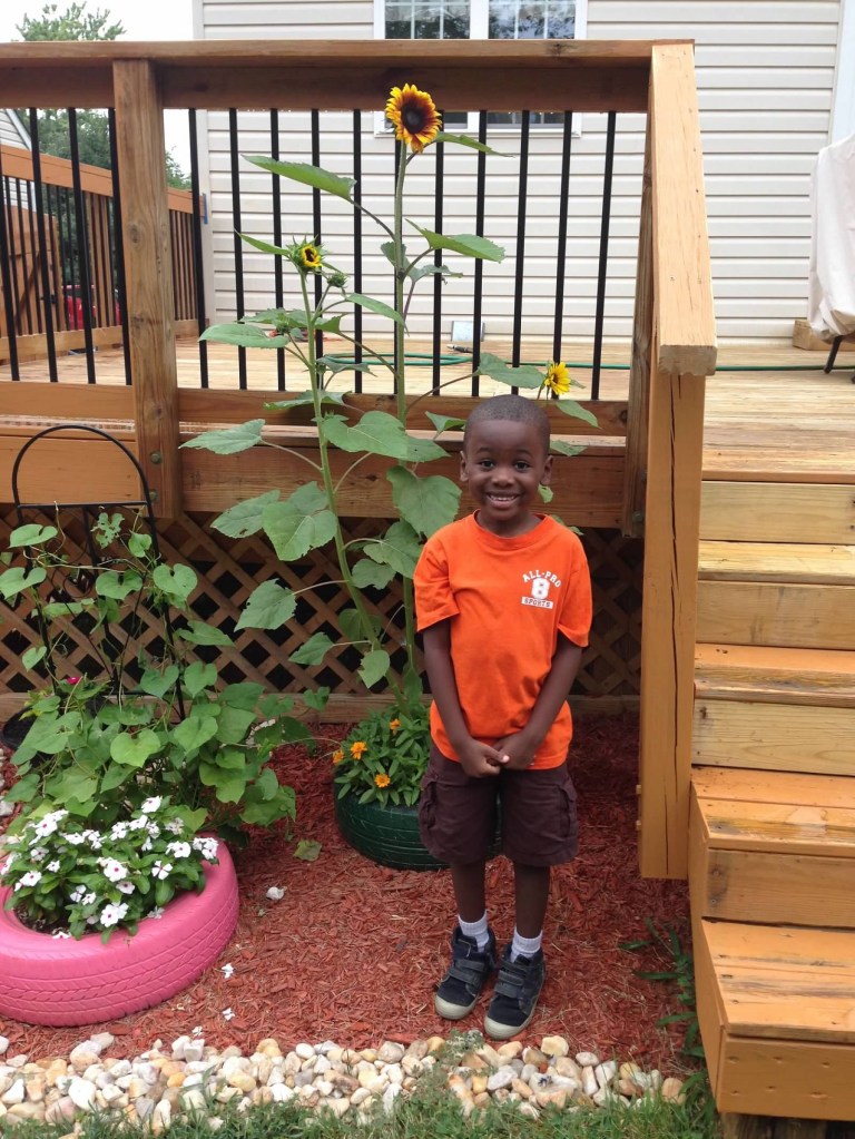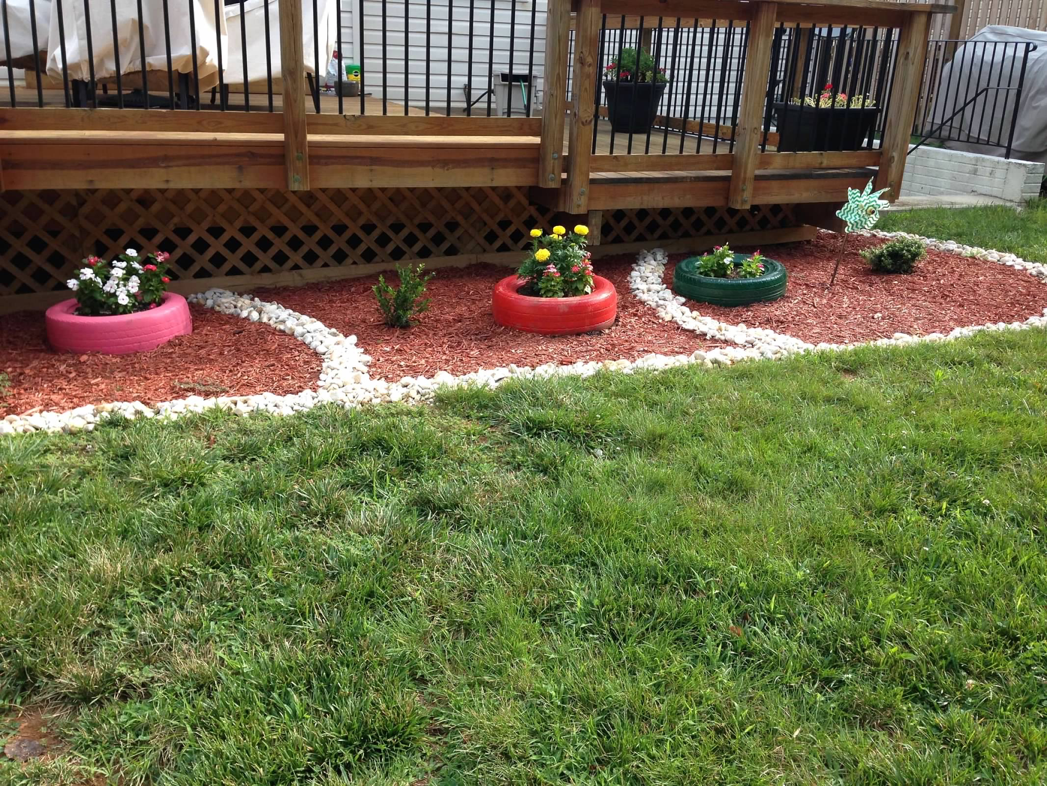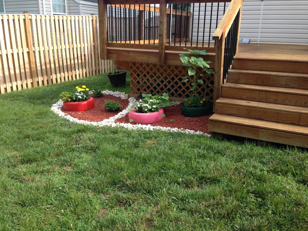 I decided I wanted the flower bed right at the bottom of the deck and started searching Pinterest for different ideas on how to create one. I came across this adorable idea for the kids to paint car tires, fill them with soil, and plant seeds in them. They painted two tires each, and I allowed them to pick which seeds they wanted to plant and where. We had sunflowers, morning glory plants, and a few other plants whose names escape me. We even have one that comes back every year. This was the beginning of my oasis.